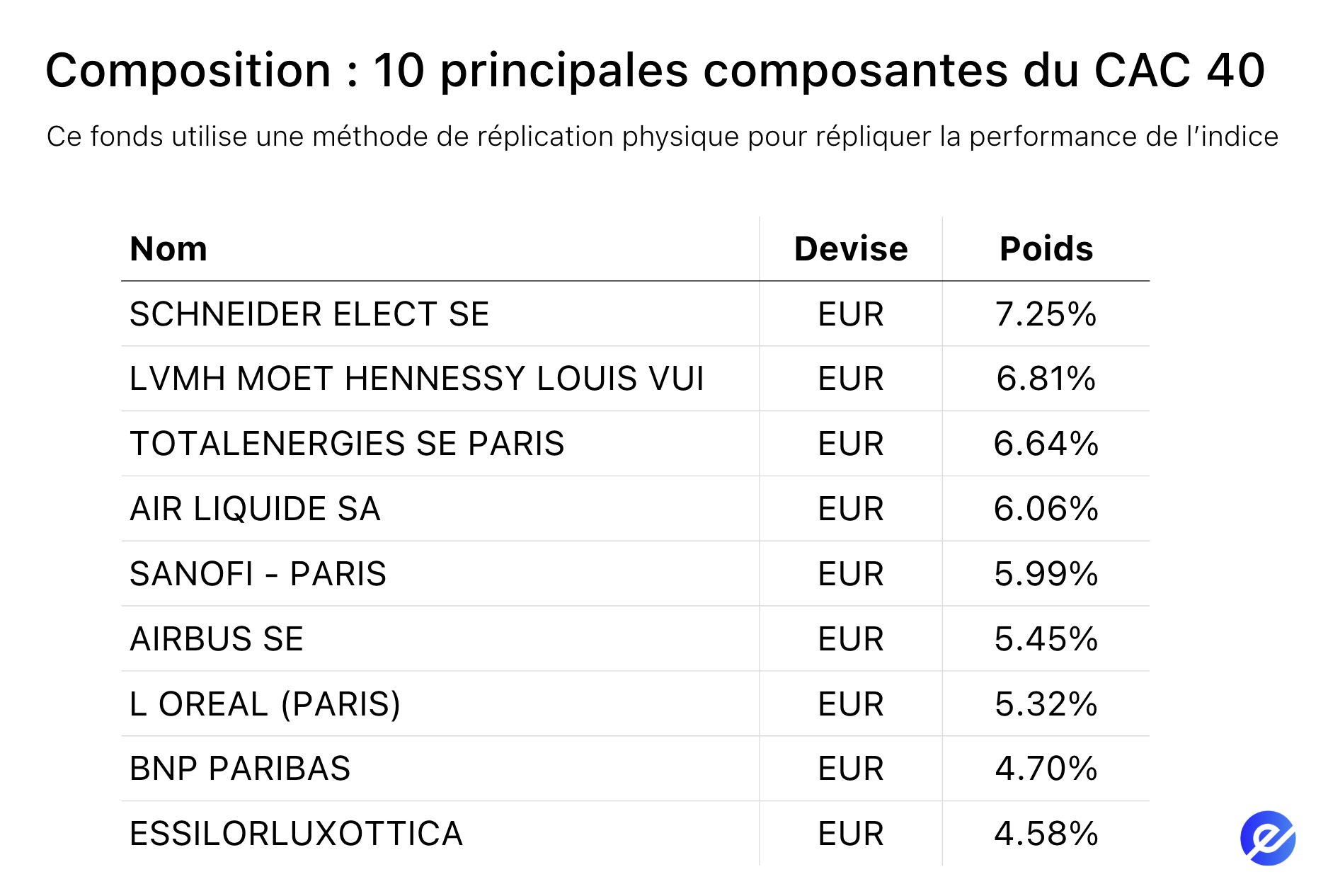 Bon à savoir : Seules les sociétés présentes sur les marchés financiers peuvent figurer dans un ETF — les entreprises privées ou non cotées en sont exclues.