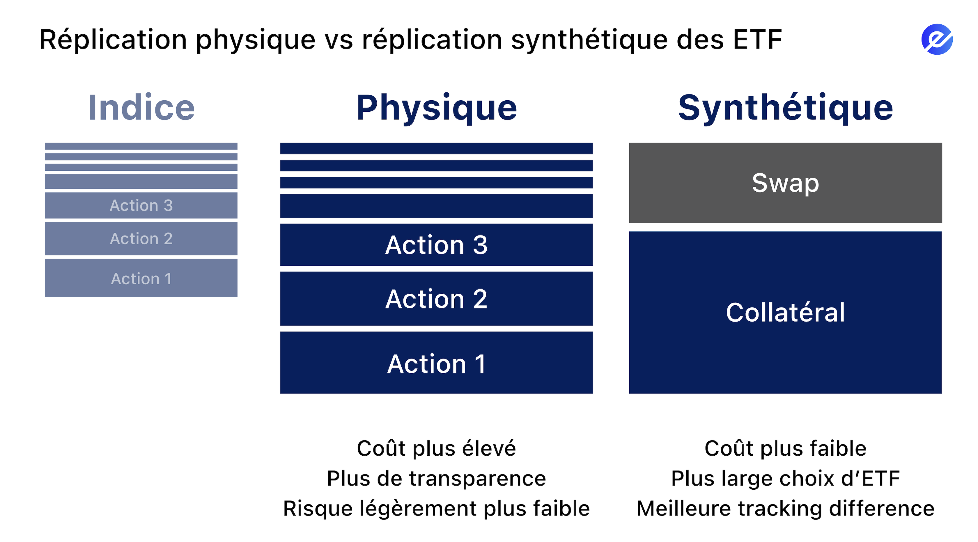 Cette approche peut sembler plus complexe, mais elle présente certains avantages. Comme avec les frais : la réplication synthétique implique des contrats financiers (swaps) et des intermédiaires, ce qui peut entraîner des coûts de structure. Mais, généralement, ces ETFs peuvent être tout aussi compétitifs, voire moins chers, que les ETFs physiques, notamment lorsqu’il s’agit d’indices complexes ou peu liquides, où la réplication physique serait plus coûteuse. L’élément à surveiller n’est donc pas seulement le type de réplication, mais bien le TER (Total Expense Ratio) et surtout la tracking difference.
