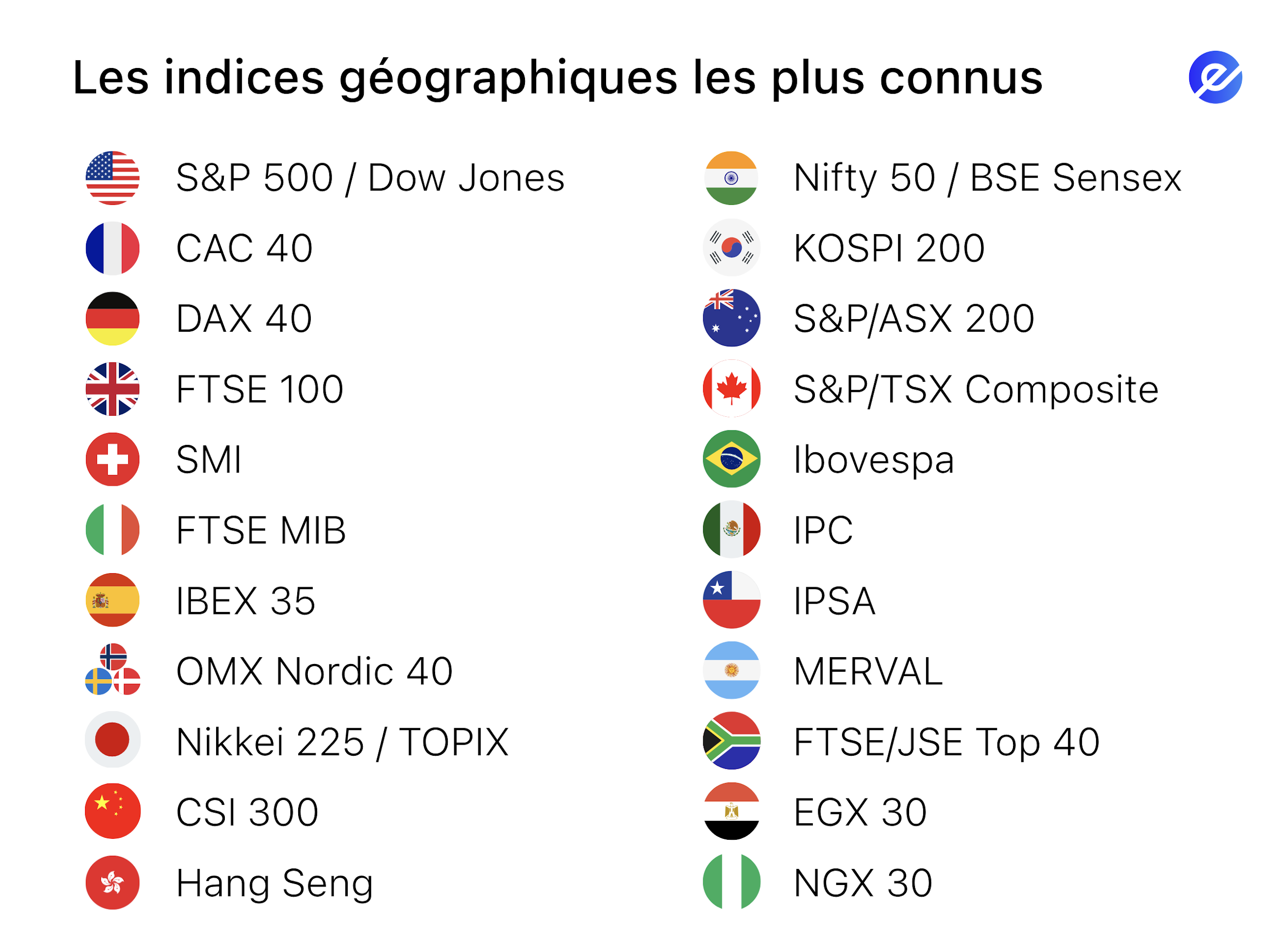 L’exemple le plus connu est le S&P 500, qui regroupe les 500 plus grandes entreprises américaines cotées en Bourse. Cet indice est une référence mondiale car il reflète la santé de l’économie américaine, la plus importante du monde.