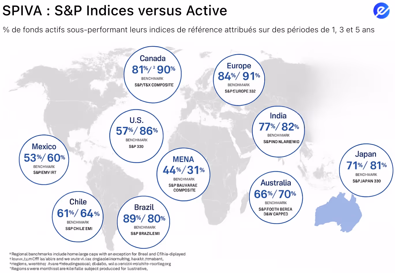 Ce rapport analyse de façon rigoureuse et statistique la performance des fonds de gestion active (c’est-à-dire gérés par des professionnels qui choisissent activement les titres à acheter et vendre), en les comparant aux indices de marché de référence – comme le S&P 500 aux États-Unis, le S&P Europe 350, ou d’autres indices dans le monde.